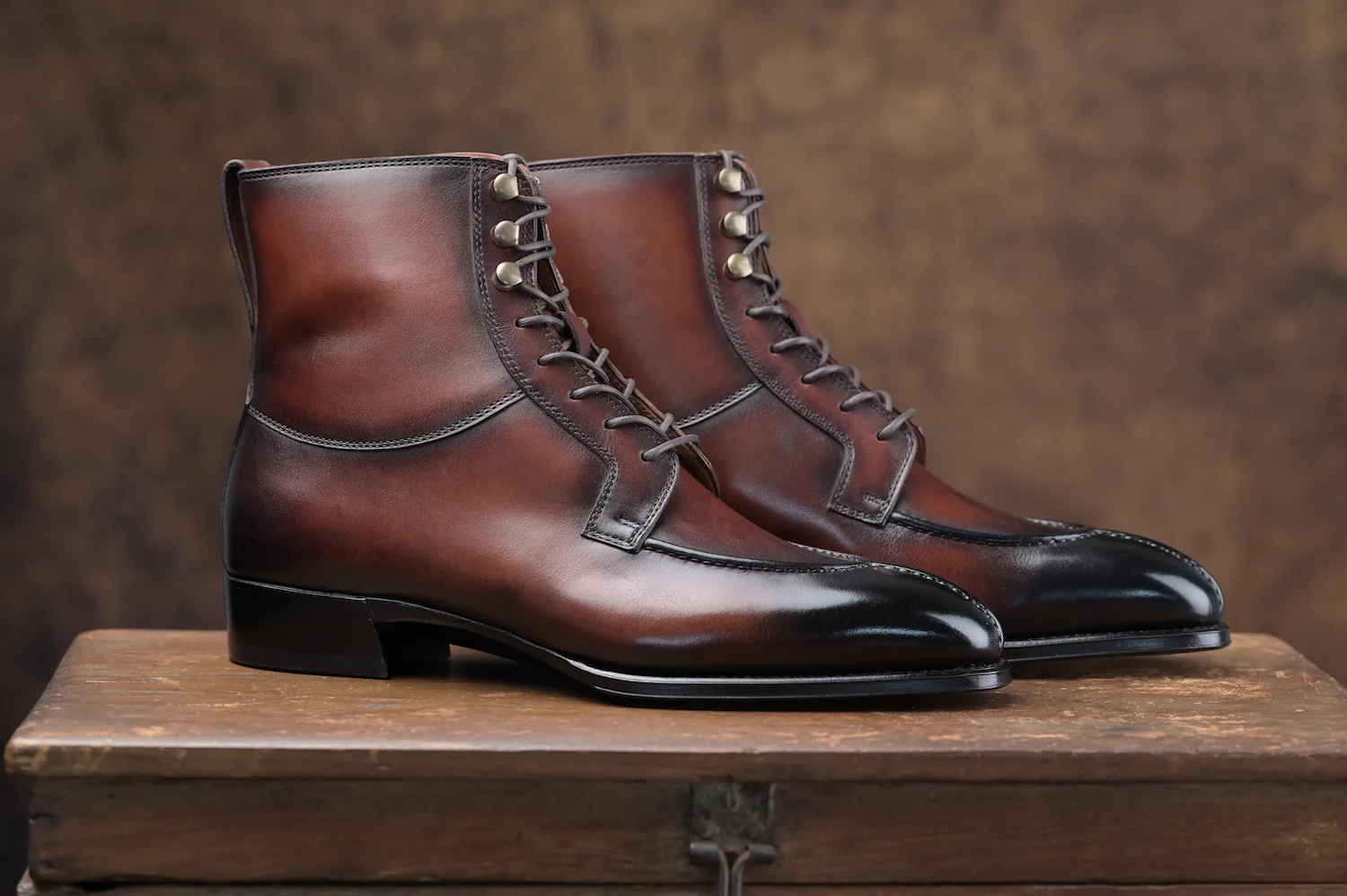 Italy crust in Walnut Patina with Leather toe puff and heel counter |